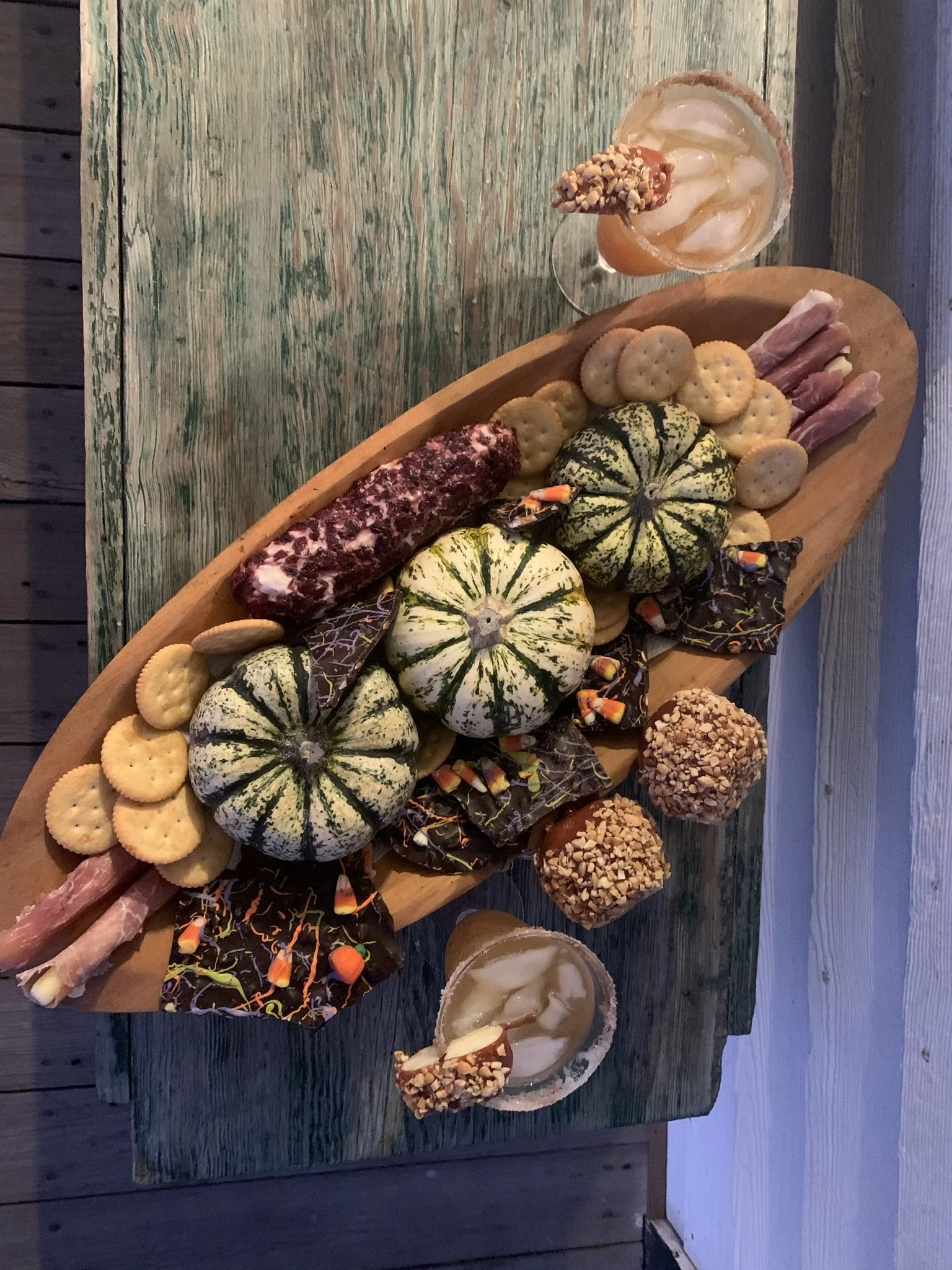 Mini Pumpkins, cinnamon/cranberry goat cheese, ritz crackers, prosciutto wrapped mozzarella, pumpkin/candy corn bark, caramel candy covered apples