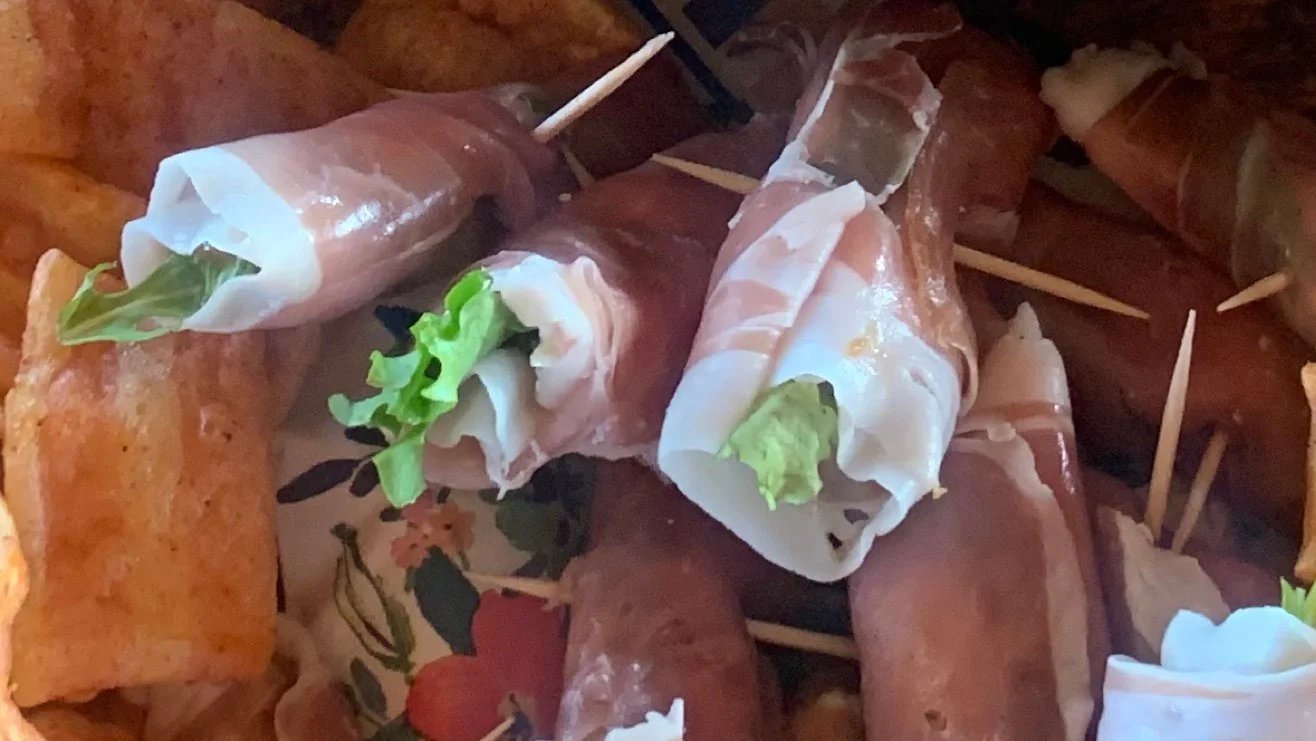 Lay flat a single piece of prosciutto. Down the middle of it smooth out a tablespoon of goat cheese. Then spoon a layer of bacon jam over the top. Place some arugula and spinach leaves down the middle. Roll it up and place a tooth pick through the center.